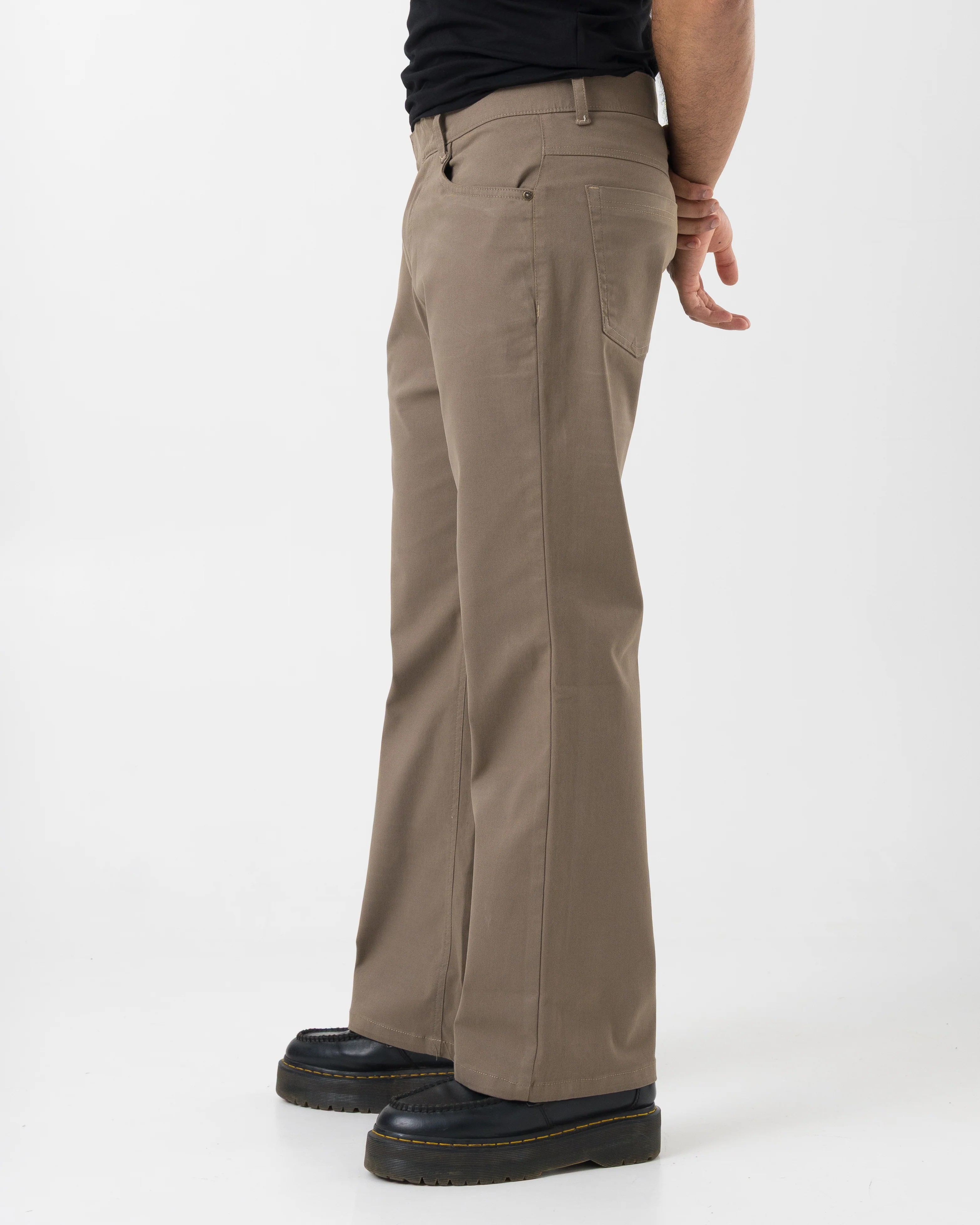 Bootcut silhouette with a clean drop — fitted through the thigh with a subtle flare below the knee. Structured like denim, feels like comfort wear.