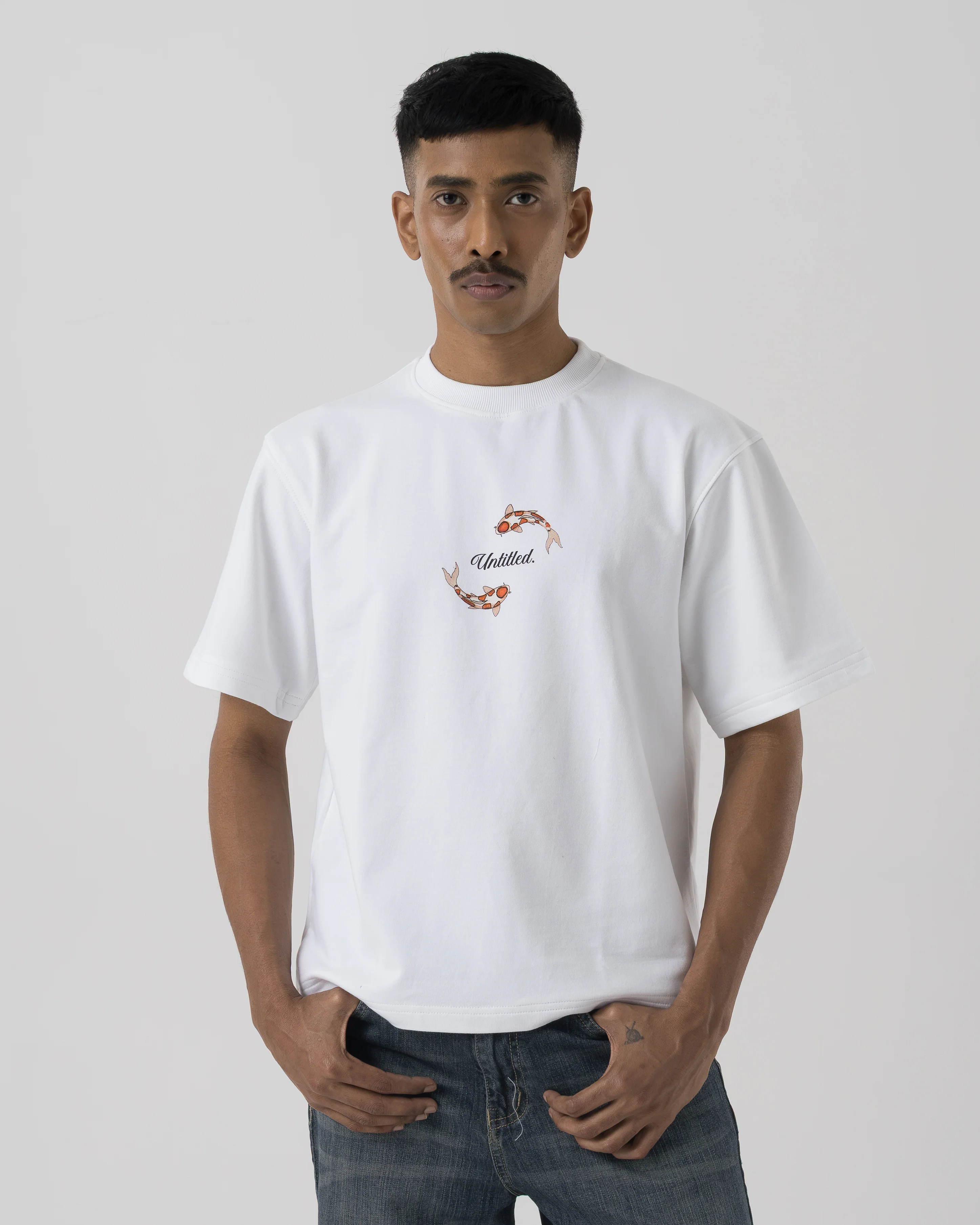 Features a minimal twin-koi Untld. emblem on the front and a large detailed koi pond artwork on the back with the message “Find your Peace Within your Chaos.” Finished with a ribbed crew neckline and a clean straight hem.