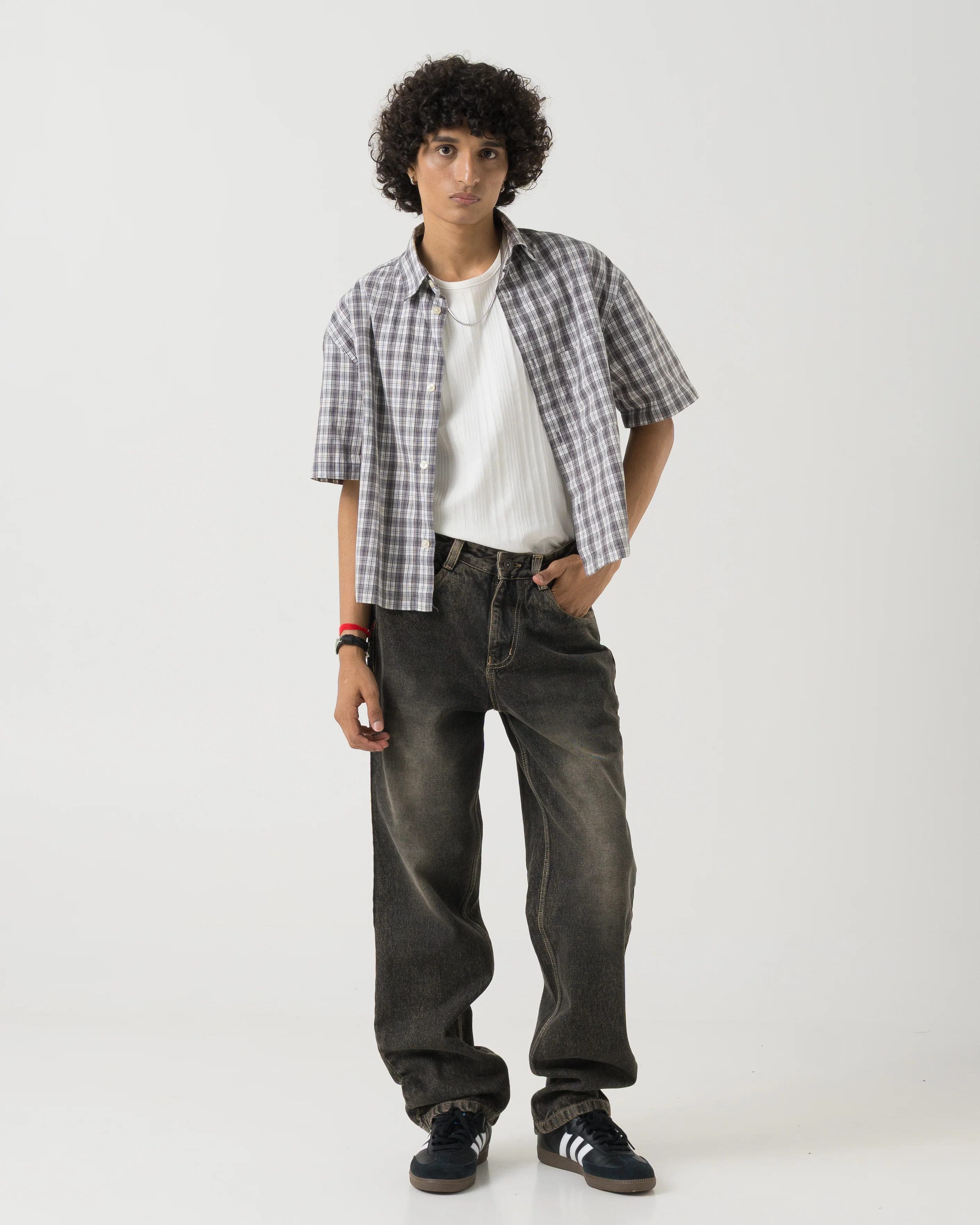Heavyweight denim, washed down to a faded black. Strong yellow tint adds warmth and character without looking forced.